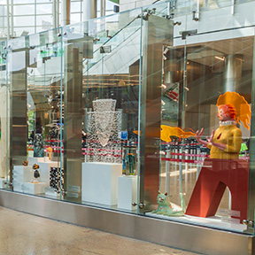 The south side glass case acts as another wall to the new Checkpoint 1 and is filled with flamboyant characters, mysterious shapes, and refine objects. It is a see-through gallery and no matter which side you’re on, you’ll find a new favorite piece every time.