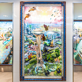 Einar and Jamex de la Torre are a powerhouse brother duo. They were born in Guadalajara, Mexico, and moved to California in the early 1970s. They cross media and defy limitations, working with glass, resin, lenticular, and more. Some of their most notable work includes mixed media lenticulars which is a unique medium using lenticular lenses to create the illusion of depth and motion. The restroom by Gate D11 on the D Concourse brings to life five different lenticulars, creating a world of whacky wonder with motion that shifts your perspective. These colorful creations capture iconic landmarks in the Seattle and Tacoma regions, mixing bright colors and diverse landscapes with northwest flare. If you stare at them long enough, you’ll still find a new favorite hidden gem inside them.