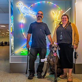 The final restroom opening came this past summer, wrapping up the Restroom Renovation project. The D1 restroom located on the D Concourse had multiple media for artist power couple, Jeremy Bert and Jen Elek. They created not just the neon art piece that adorns the entry to this restroom, but also the Pet Relief area art and four glass cases inside the Nursing Room. Jeremy Bert works mostly with electric light, neon, and manipulated reclaimed signage, while partner Jen Elek is a studio artist, glassblower, and educator, both based out of Seattle. The neon work out front, “The Illuminated Palouse,” is a vivacious burst of color outlining different animals native to the Palouse region that wraps around the corner with a gorgeous glow. The Pet Relief Area displays a wiener dog chasing its tail with a bronze log below, inlaid with different colored glass rondels.