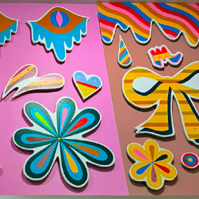 If you’re on the Baggage Claim Level near Bag Carousel 13 or 16, don’t forget to look up. These acrylic on maple plywood pieces POP with unique shapes and bold colors that almost leap off the wall. The mix of the colors and shapes has you wanting to grab them straight off the wall and sticker your Pee-Chee with this 90s nostalgia.