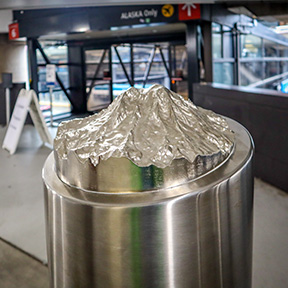 As you cross Skybridge 1 at the south end of parking garage, you’ve likely seen the lipstick toppers for the bollards.  In early 2025, Skybridge 6 also got a bollard upgrade. Nothing says welcome to the Pacific Northwest better than mountains and hiking trails. The stainless steel bollards feature mini-Mt. Rainier replicas that sit atop and a path of the Wonderland Trail on the others. Take a sensory journey by following the crevices to the peak, or adventure beyond with the etched-in, winding route that encircles Mt. Rainier. These bollards were designed and made possible by artists, Kyle Olson and Sandra Williams.