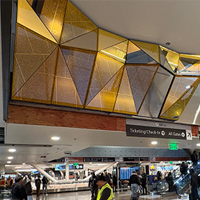 This suspended art piece is made of stainless-steel mesh, layered with hundreds of acrylic tiles in translucent colors. As light hits the translucent pieces, it comes to life! The colors create waves hanging above the newly opened recompose area at the end of Checkpoint 6 on the far north end of the airport.