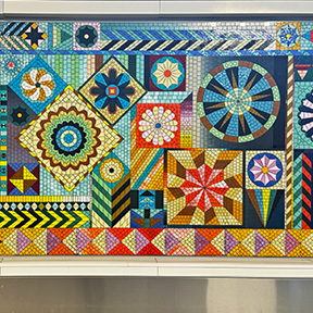 This mosaic tile piece colorfully quilts an otherwise industrial baggage enclosure in the Alaska Airlines Ticketing Lobby and check-in area. Inspired at a young age by her mother’s quilts, artist, Sarah More, pays homage to the city of Seattle, weaving in patterns of shooting stars, a mariner’s compass, and the Seattle’s official flower, the dahlia.