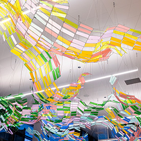 This Seattle-based artist is in the process of installing his kiln formed glasswork consisting of 13 unique compositions, each representing a distinct Pacific Northwest ecosystem for the north end of the Bridge Level. The artworks tell a story of rich interconnection, narrating how the diversity of flora and fauna, geology and humanity unite to form this special region known as Cascadia.