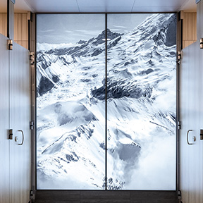 Backlit black and white photography faces you the moment you enter the restroom doors. These men’s and women’s restrooms between checkpoints 5 and 6 are the newest in the airport, make sure to check them out!  These beautiful landscape photos show off snowy peaks, foggy forests, and sunlit scenes.