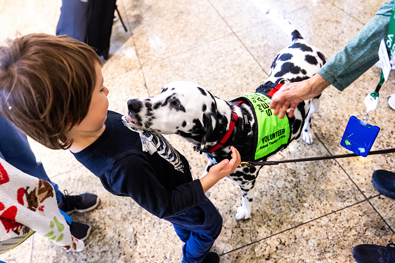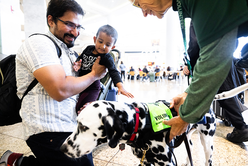With Tuck, a simple walk through the terminal turns into a parade of smiles. “It usually takes us 10 minutes just to get from the volunteer office (before security) to the concourse,” Gonzalez said. “We get stopped by TSA agents, flight attendants, travelers — you name it. Everyone wants to say hello.” Like many Dalmatians, Tuck loves being around everyone, as long as his favorite person (Gonzalez) is nearby.
