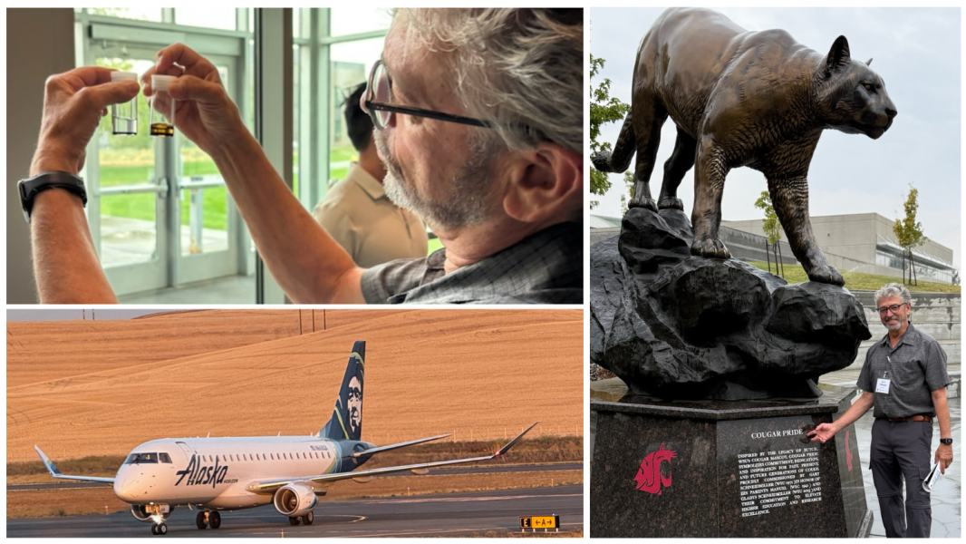 Clockwise from top left: Comparing a small sample of SAF to traditional kerosene; “Cougar Pride” at WSU; waiting for my flight home from Pullman to Seattle