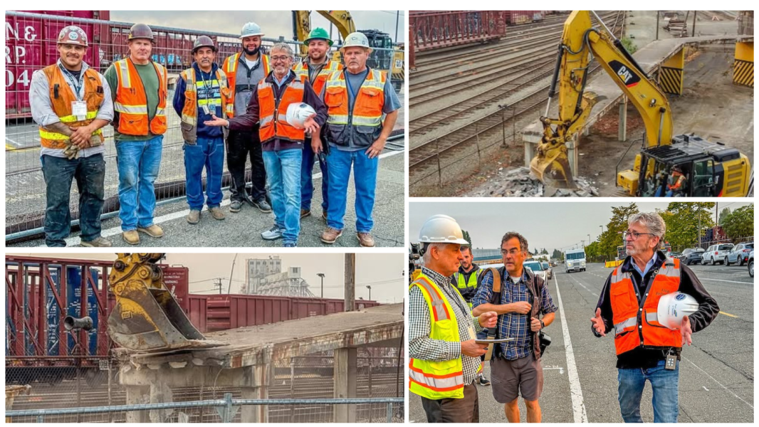 Clockwise from top left: With the Port of Seattle’s construction services team; taking down the bridge to nowhere; talking with Seattle Times reporter Mike Lindblom