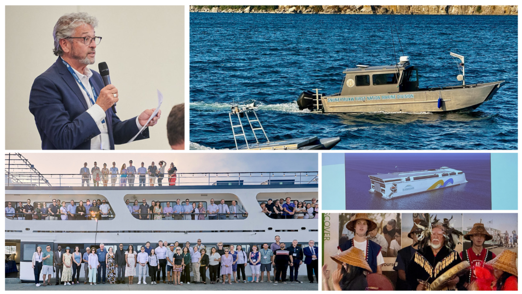 Clockwise from top left: Asking questions and seeking clarity; First Nations autonomous security platform; 130-meter, 2100-passenger, 225-car electric ferry; ceremony celebrating salmon in Nanaimo; conference attendees en route to salmon bake — all aboard!